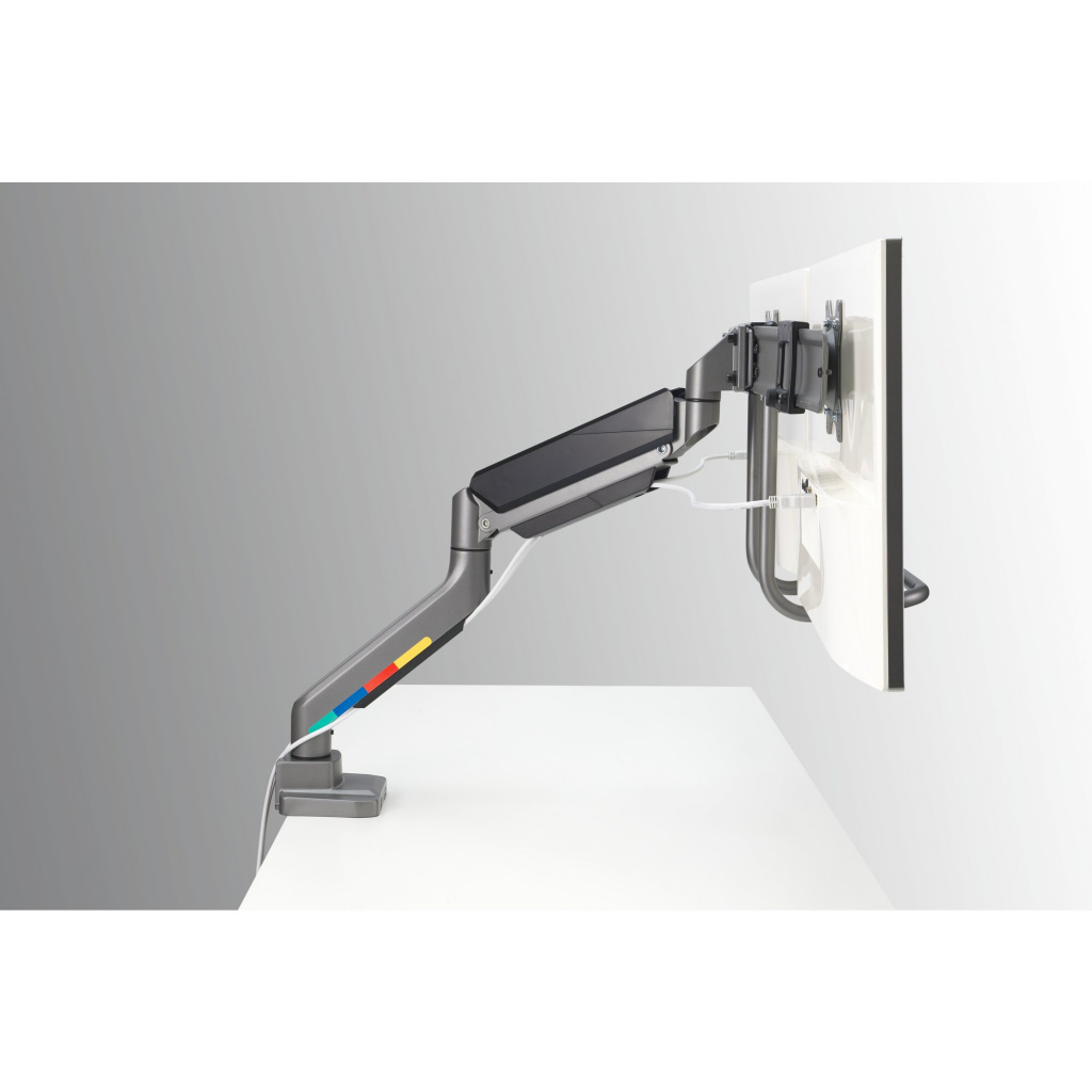 De SmartFit™ Dual Monitor Arm met Crossbar en Handle is een ideale oplossing voor gedeelde werkplekken. De monitorarm maakt gebruik van gasveertechnologie om moeiteloze ergonomische controle te bieden voor een dual-monitoropstelling. Pak gewoon de comfortabele handgreep vast om uw monitors met een minimale aanraking hoger of lager te zetten. De gasveer laat zelfs de zwaarste dual-monitoropstellingen gewichtloos aanvoelen, zodat u de ergonomische positionering gedurende de dag eenvoudig kunt aanpassen met minimale fysieke inspanning. Het is heel eenvoudig om de perfecte kijkhoek te creëren met de afzonderlijke hoogte-aanpassing voor elke monitor. De innovatieve gebogen horizontale rail biedt plaats aan twee 32” monitors naast elkaar (tot 9 kg per stuk) en de C-klem maakt de installatie probleemloos. 5 jaar beperkte garantie inbegrepen.