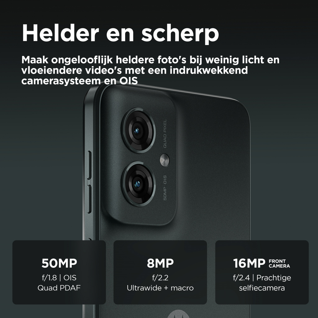 Maak kennis met een smartphone waarbij entertainment in het DNA zit. De nieuwe moto g55 5G. Breng series, films en games tot leven op een indrukwekkend 6,49-inch FHD+-display van 120 Hz.(1) Hoor geluid uit elke richting met stereoluidsprekers en Dolby Atmos®.(2) Maak superheldere foto’s en vloeiendere video’s met een camerasysteem van 50 MP met optische beeldstabilisatie (OIS).(3) En onderscheid je van de rest met een opvallend design, inclusief opties in zacht vegan leer. Met de moto g55 5G kun je non-stop bingewatchen dankzij een accu die lang meegaat en snel wordt opgeladen. Bewaar meer van je favorieten met heel veel ingebouwde opslag. En geniet van entertainment met de snelheid van 5G dankzij een krachtige octa-core processor. De moto g55 5G tilt entertainment naar nieuwe hoogten.
