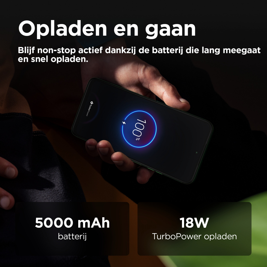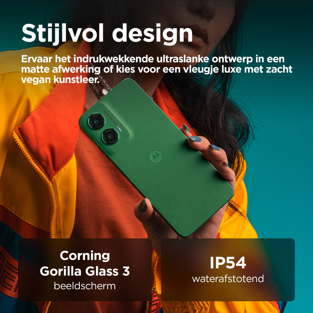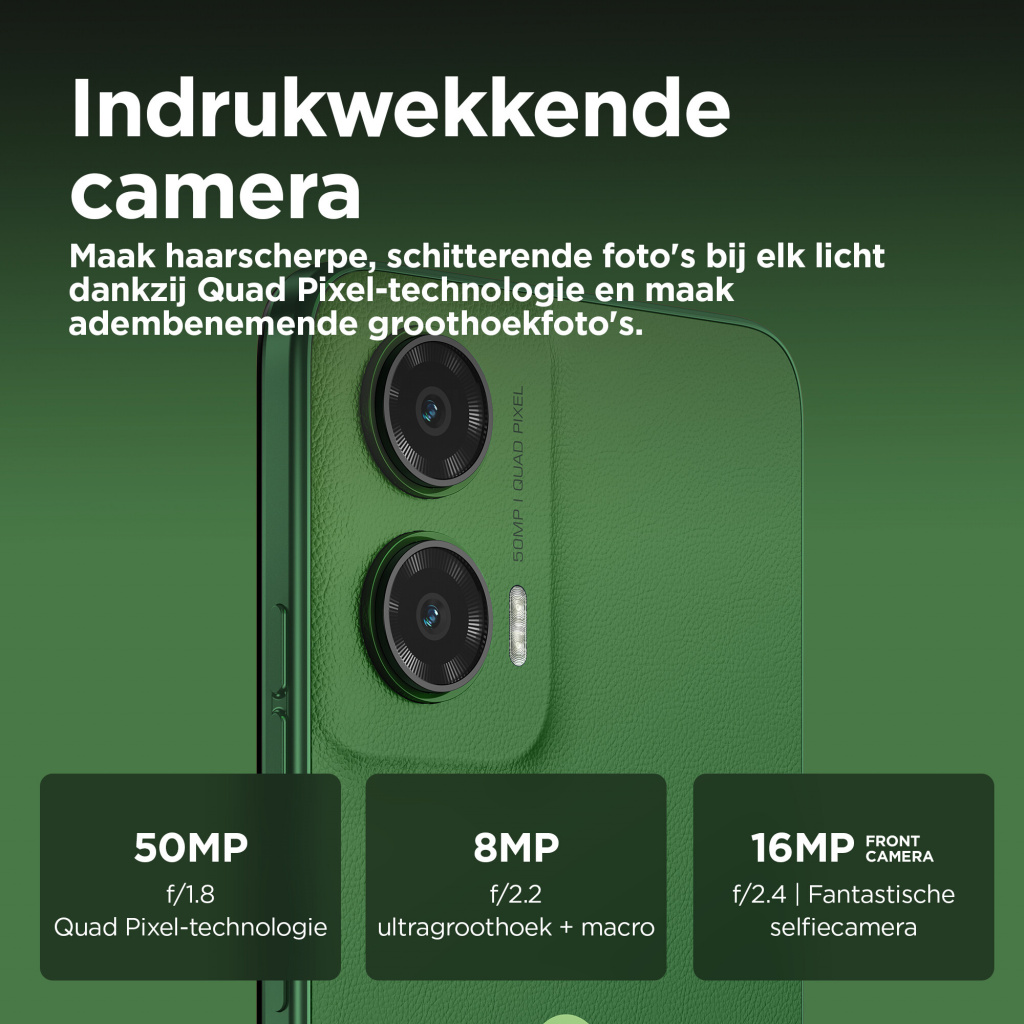 De grootste momenten in het leven verdienen een groot podium. Maak kennis met de moto g35 5G. Met een enorm FHD+-display van 6,72 inch komen je films, games en videogesprekken tot leven, zelfs in helder licht, met een piekhelderheid van 1000 nits. Dat alles wordt aangevuld met multidimensionaal Dolby Atmos®-geluid op stereoluidsprekers of je favoriete hoofdtelefoon. Maak adembenemende opnamen met de ultragroothoeklens of maak scherpe, heldere foto’s bij elk licht met de 50 MP-camera met Quad Pixel-technologie. Geniet van het prachtige, superdunne eersteklas design, inclusief een optie met het luxe gevoel van vegan leer. Profiteer van supersnelle 5G met een octa-core processor en krijg 4 GB RAM en maximaal 256 GB opslag.(2,4) Bovendien kun je altijd doorgaan doordat de accu lang meegaat. De moto g35 5G is gemaakt voor grote momenten.