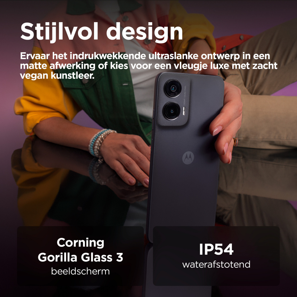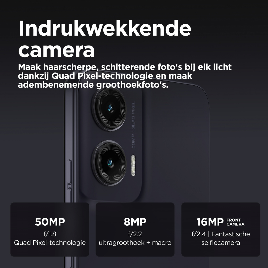 De grootste momenten in het leven verdienen een groot podium. Maak kennis met de moto g35 5G. Met een enorm FHD+-display van 6,72 inch komen je films, games en videogesprekken tot leven, zelfs in helder licht, met een piekhelderheid van 1000 nits. Dat alles wordt aangevuld met multidimensionaal Dolby Atmos®-geluid op stereoluidsprekers of je favoriete hoofdtelefoon. Maak adembenemende opnamen met de ultragroothoeklens of maak scherpe, heldere foto’s bij elk licht met de 50 MP-camera met Quad Pixel-technologie. Geniet van het prachtige, superdunne eersteklas design, inclusief een optie met het luxe gevoel van vegan leer. Profiteer van supersnelle 5G met een octa-core processor en krijg 4 GB RAM en maximaal 256 GB opslag.(2,4) Bovendien kun je altijd doorgaan doordat de accu lang meegaat. De moto g35 5G is gemaakt voor grote momenten.