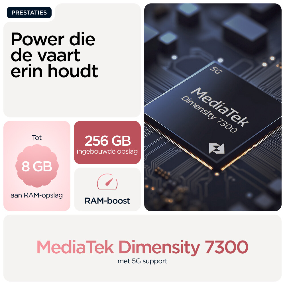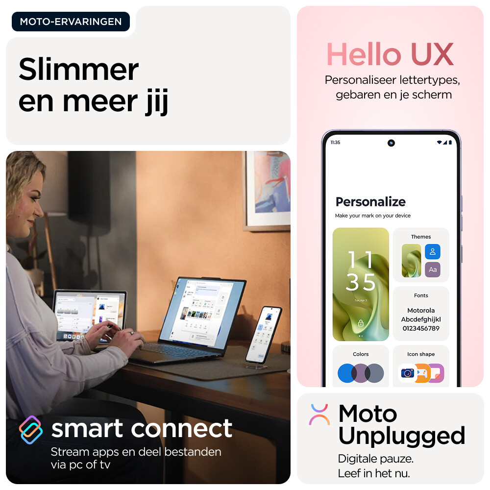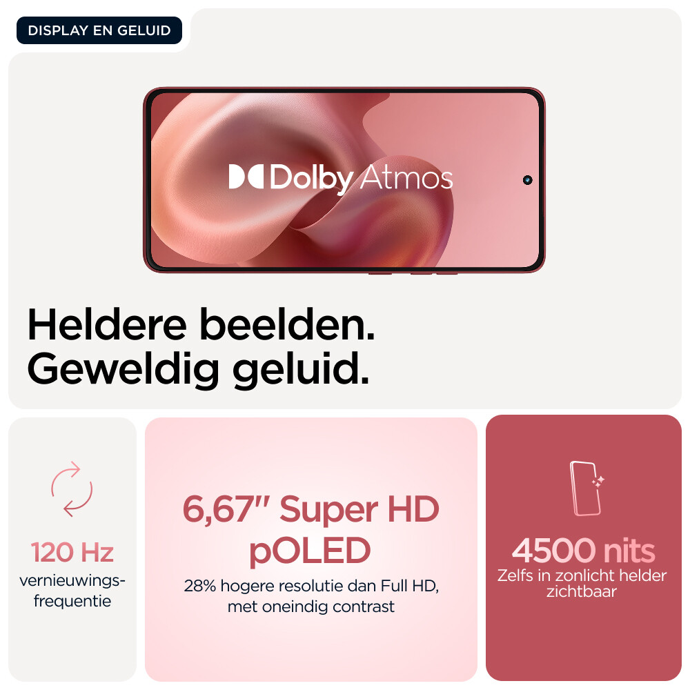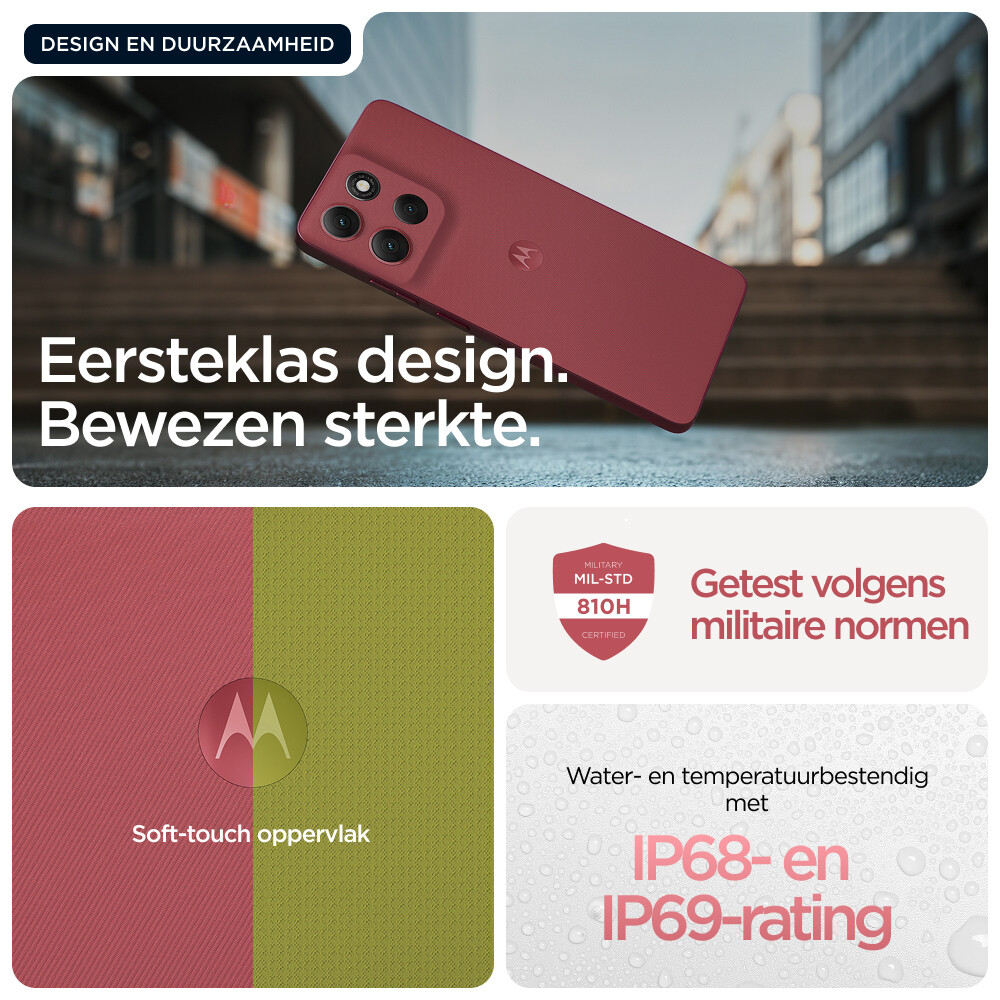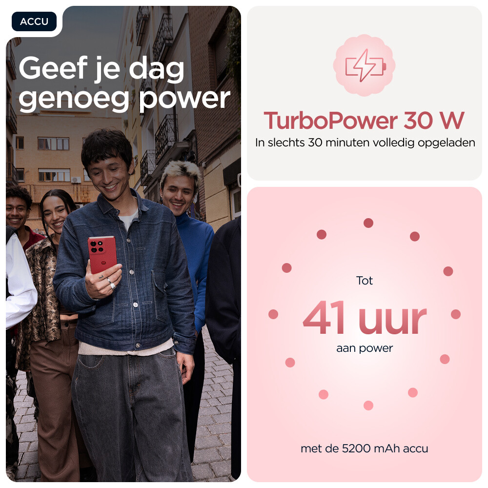 Voor wie grenzen wil verleggen in het leven: maak kennis met de moto g86 5G. Dit model is prachtig vormgegeven met hoogwaardige materialen en valt echt op door z’n opvallende design met geavanceerde water- en valbestendigheid(6,7). Zie alles op een ultra-helder 6,67-inch Super HD (1220p) display met Dolby Atmos®-geluid. Leg prachtige foto’s vans met de 50MP Sony LYTIA™ 600-camera met moto ai(12) en maak moeiteloos professionele foto’s. Profiteer van 41 uur batterijduur in slechts enkele minuten met TurboPower™ opladen(1,13). Ervaar de kracht van een geavanceerde processor en 8 GB – uitbreidbaar tot 24 GB met RAM-boost – en tot 256 GB aan opslag(3,9). Verhoog je creatieve vrijheid, soepele interactie en gemoedsrust met exclusieve Moto-functies. Geniet van het avontuur in het leven met de moto g86 5G.
