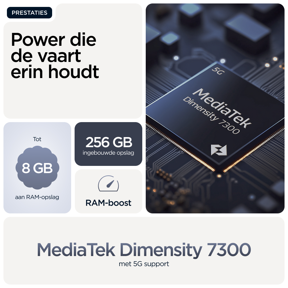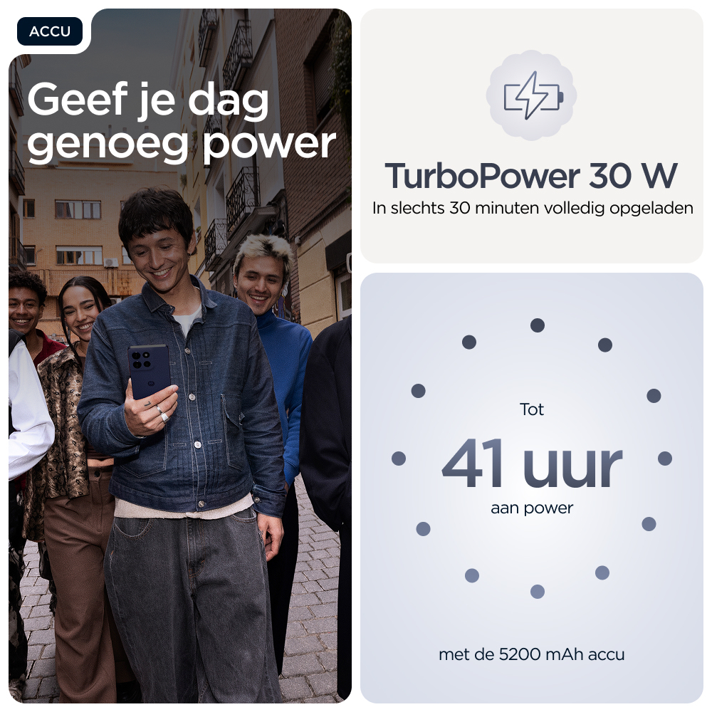 Voor wie grenzen wil verleggen in het leven: maak kennis met de moto g86 5G. Dit model is prachtig vormgegeven met hoogwaardige materialen en valt echt op door z’n opvallende design met geavanceerde water- en valbestendigheid(6,7). Zie alles op een ultra-helder 6,67-inch Super HD (1220p) display met Dolby Atmos®-geluid. Leg prachtige foto’s vans met de 50MP Sony LYTIA™ 600-camera met moto ai(12) en maak moeiteloos professionele foto’s. Profiteer van 41 uur batterijduur in slechts enkele minuten met TurboPower™ opladen(1,13). Ervaar de kracht van een geavanceerde processor en 8 GB – uitbreidbaar tot 24 GB met RAM-boost – en tot 256 GB aan opslag(3,9). Verhoog je creatieve vrijheid, soepele interactie en gemoedsrust met exclusieve Moto-functies. Geniet van het avontuur in het leven met de moto g86 5G.