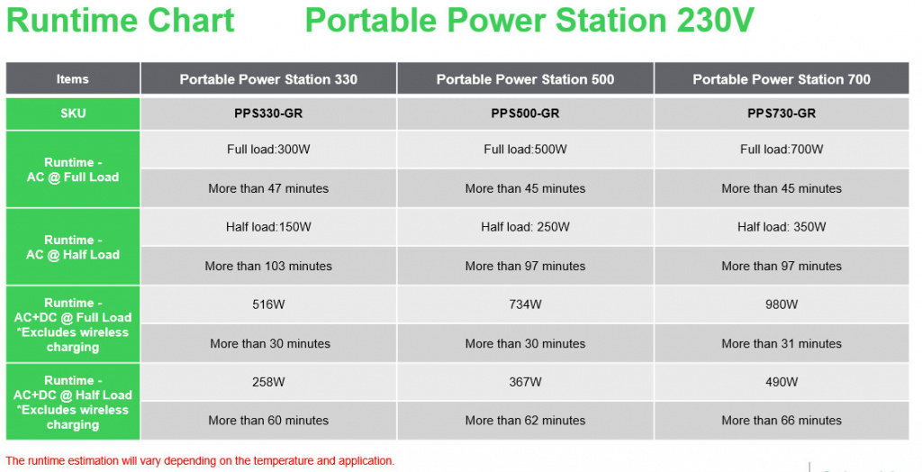 De accuduur* is afhankelijk van de belasting, de optelsom van het geleverde vermogen aan alle aangesloten apparaten. De verwachte accuduur* lees je eenvoudig af in de runtime tabel, zie afbeeldingen.