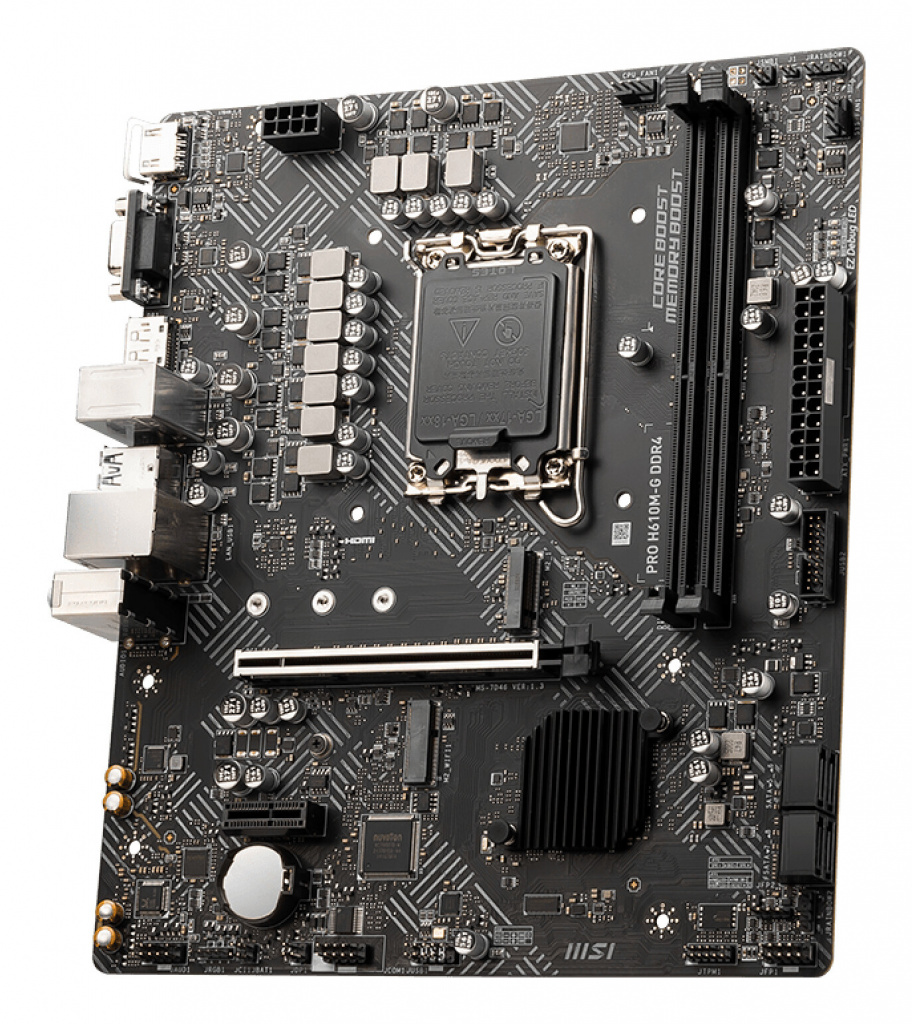 MSI PRO H610M-G DDR4. Processorfabrikant: Intel, Processor socket: LGA 1700, Compatibele processors: Intel® Core™ i9. Ondersteunde geheugen types: DDR4-SDRAM, Maximum intern geheugen: 64 GB, Geheugen slots type: DIMM. Ondersteunde opslagstationinterfaces: M.2, SATA III, Ondersteunde types opslag-drives: SSD. Ethernet interface type: Gigabit Ethernet. Component voor: PC, Moederbord form factor: micro ATX, Moederbord chipset familie: Intel
