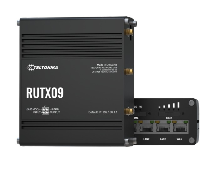 RUTX09 is an LTE-A Cat 6 cellular IoT router with dual-SIM Carrier Aggregation and four Gigabit Ethernet interfaces.
