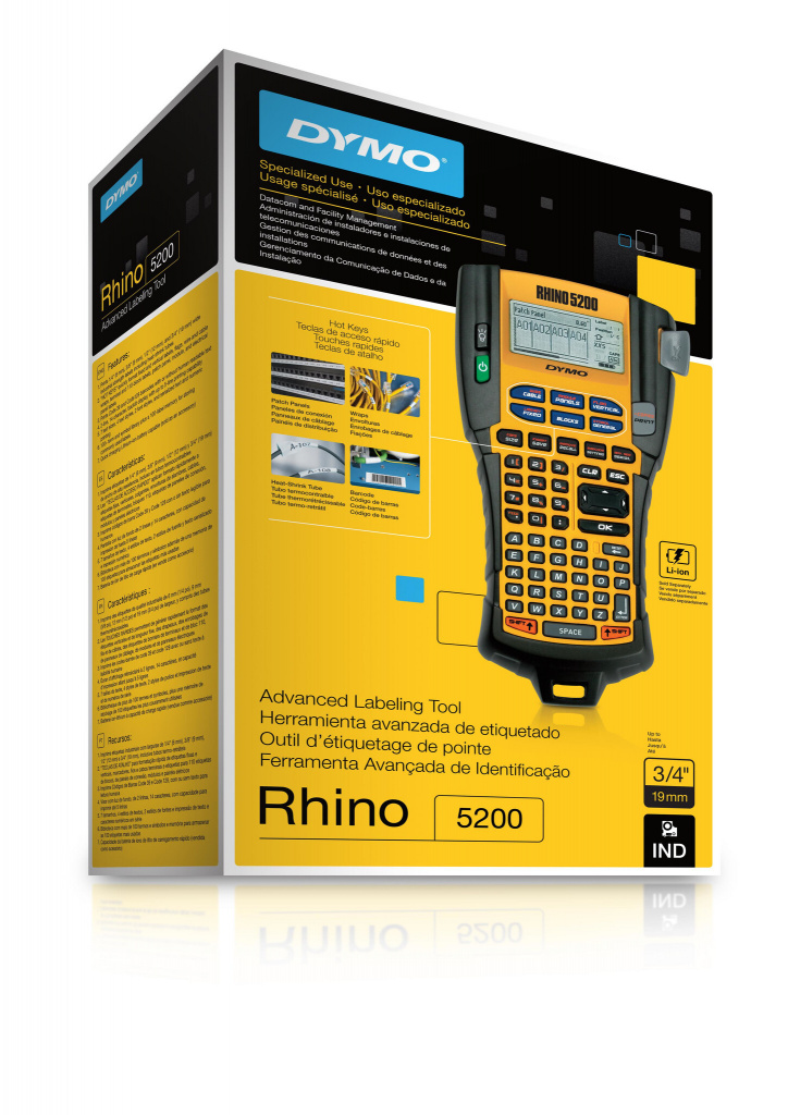 DYMO RHINO 5200. Toetsenbordindeling: ABC. Printtechnologie: Thermo transfer, Maximale resolutie: 180 x 180 DPI, Printsnelheid (metrisch): 10 mm/sec. Ondersteunde papierwijdte: 6, 9, 12, 19 mm. Kleur van het product: Zwart, Geel