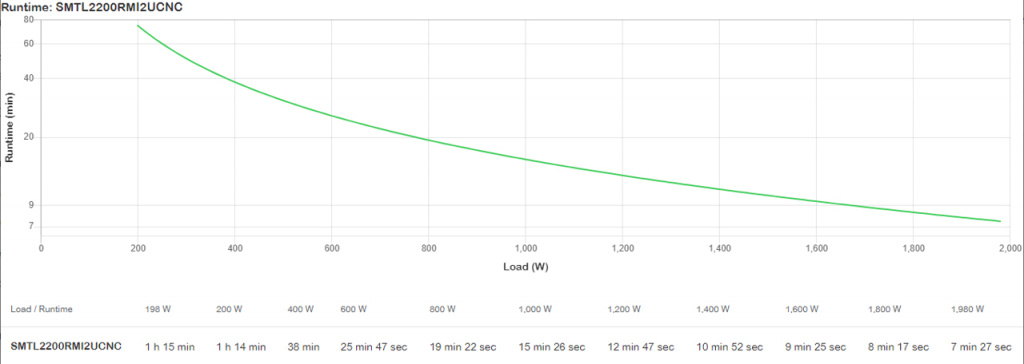 De te verwachten accuduur lees je eenvoudig af in de runtime grafiek, je vindt deze terug tussen de productafbeeldingen. Je kunt zo eenvoudig zien hoelang de ups bij een bepaalde belasting noodstroom levert.