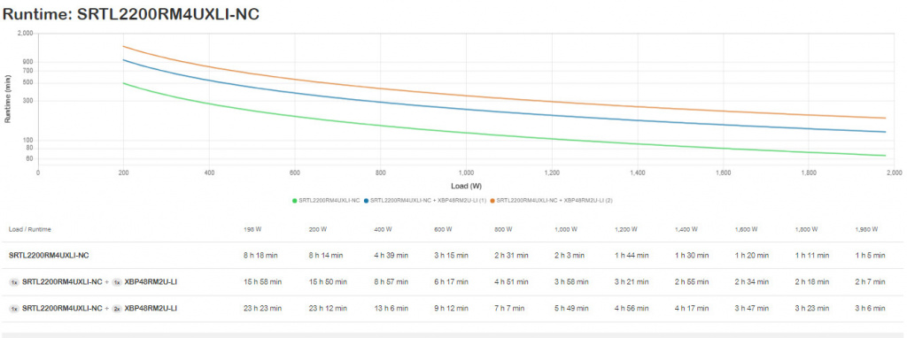De te verwachten accuduur lees je eenvoudig af in de runtime grafiek, je vindt deze terug tussen de productafbeeldingen. Je kunt zo eenvoudig zien hoelang de ups bij een bepaalde belasting noodstroom levert.