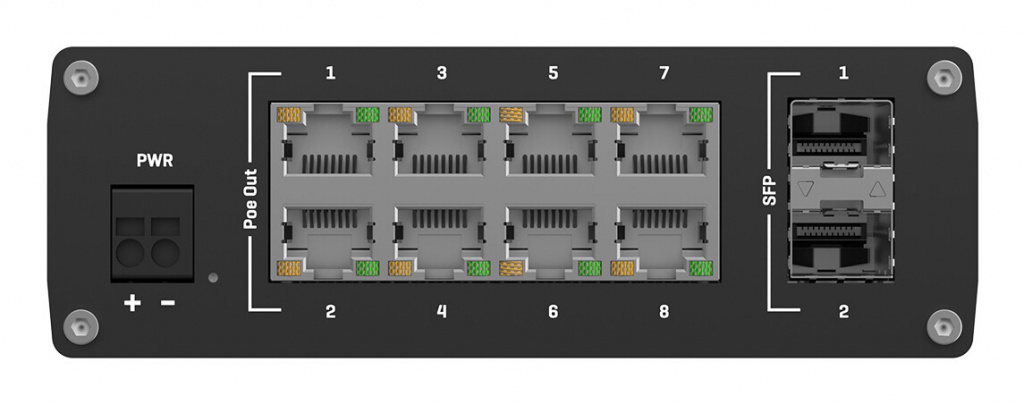 Industrial Ethernet switch with 2 SFP ports for Fiber-optic communication and 8Gigabit Ethernet ports that support IEEE802.af and IEE802.3at PoE standards.