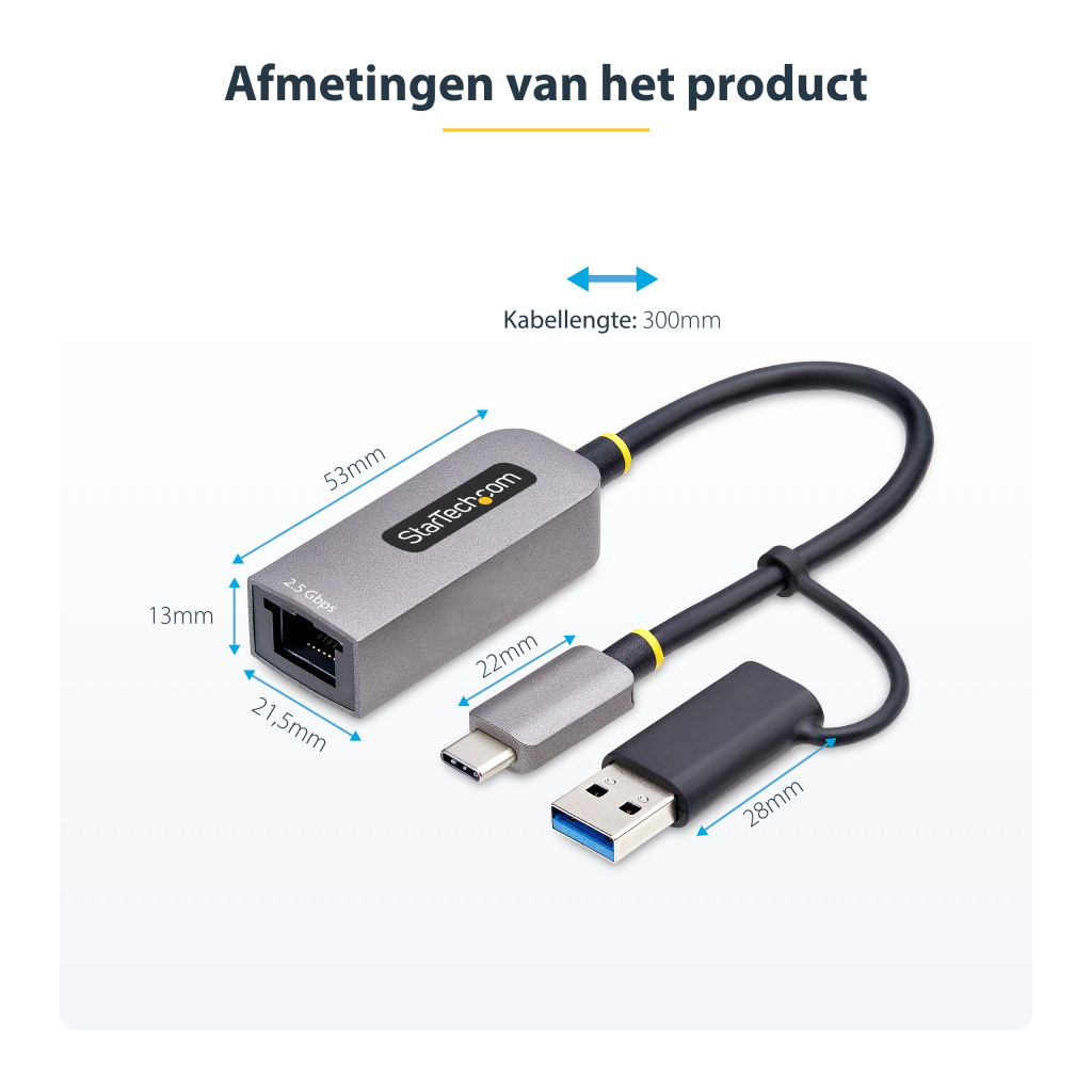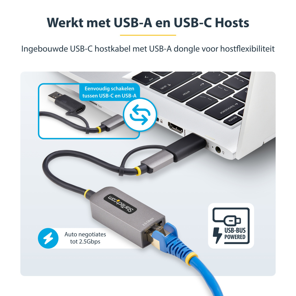 Voeg 2,5GbE netwerktoegang toe aan uw laptop, tablet of iPhone via een beschikbare USB Type-C of Type-A poort. Deze USB 3.0 Type-C naar Gigabit netwerkadapter verdubbelt uw netwerkprestaties op bestaande Cat5e kabels, waardoor u de bestaande bekabelingsinfrastructuur niet hoeft aan te passen of uit te breiden. Deze veelzijdige adapter heeft een ingebouwde 15 cm USB-kabel en wordt via de bus gevoed. De voeding komt rechtstreeks van de USB-poort van de computer, en zorgt voor minder warboel en een eenvoudigere installatie doordat er geen externe voedingsadapter meer nodig is.