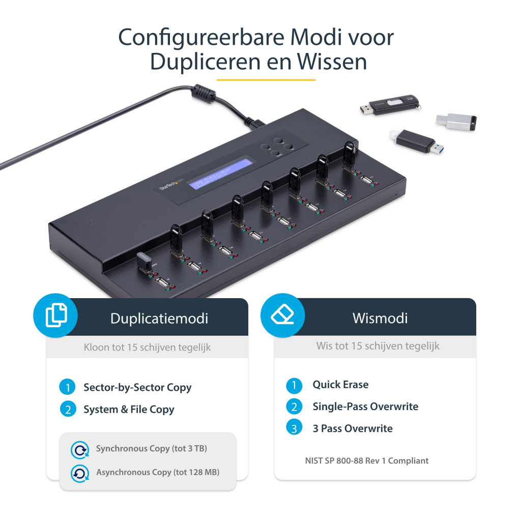 Met de schijfduplicator/-wisser kunt u tot 15 flashdrives tegelijkertijd wissen. Zo kunt u gemakkelijk grote batches USB-schijven wissen voor hergebruik. De flashdrive-duplicator heeft drie modi voor het wissen van schijven: quick erase, single pass erase en multi-pass erase (voldoet aan de normen van het Amerikaanse Ministerie van Defensie).