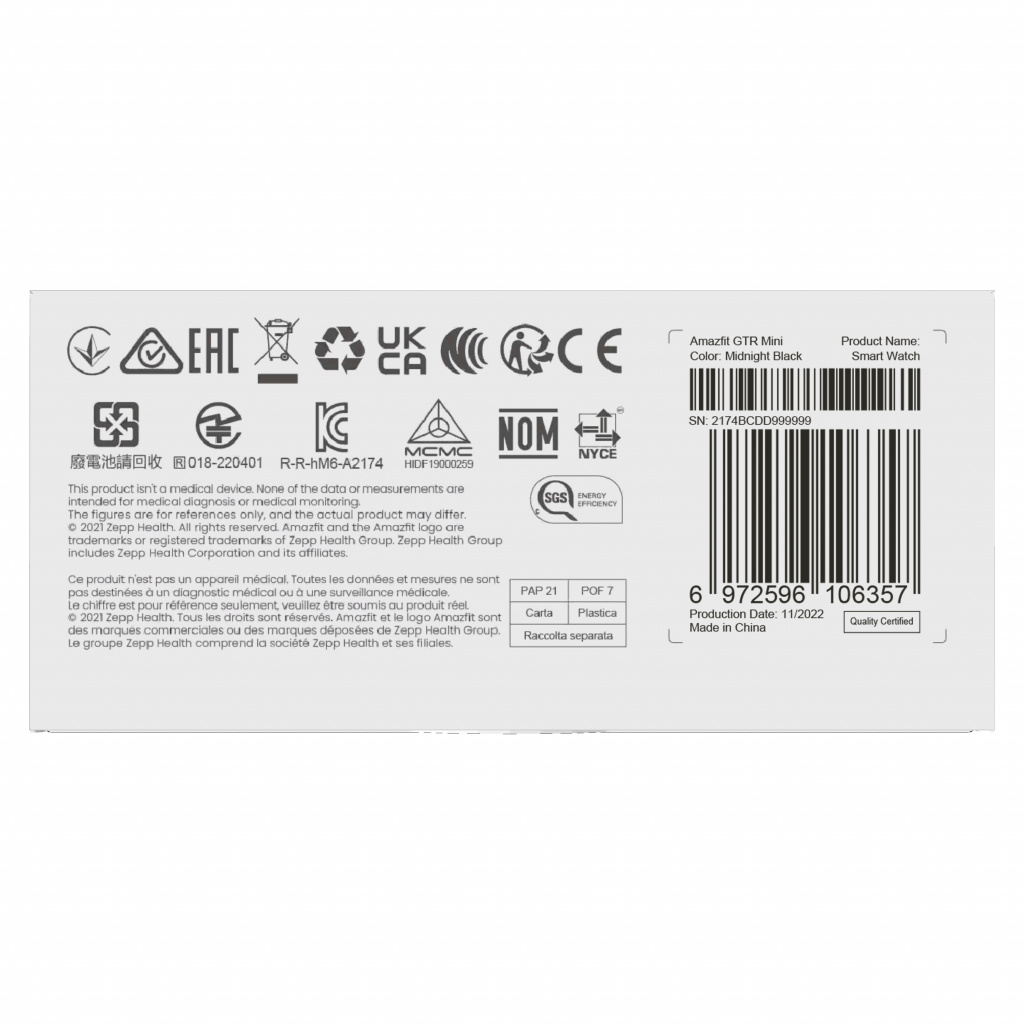 Amazfit GTR Mini. Beeldschermdiagonaal: 3,25 cm (1.28″), Display technologie: AMOLED, Resolutie: 416 x 416 Pixels, Touchscreen. GPS. Capaciteit van de accu/batterij: 280 mAh. Gewicht: 36,2 g. Band materiaal: Silicone, Band kleur: Zwart, Maat band: Een maat